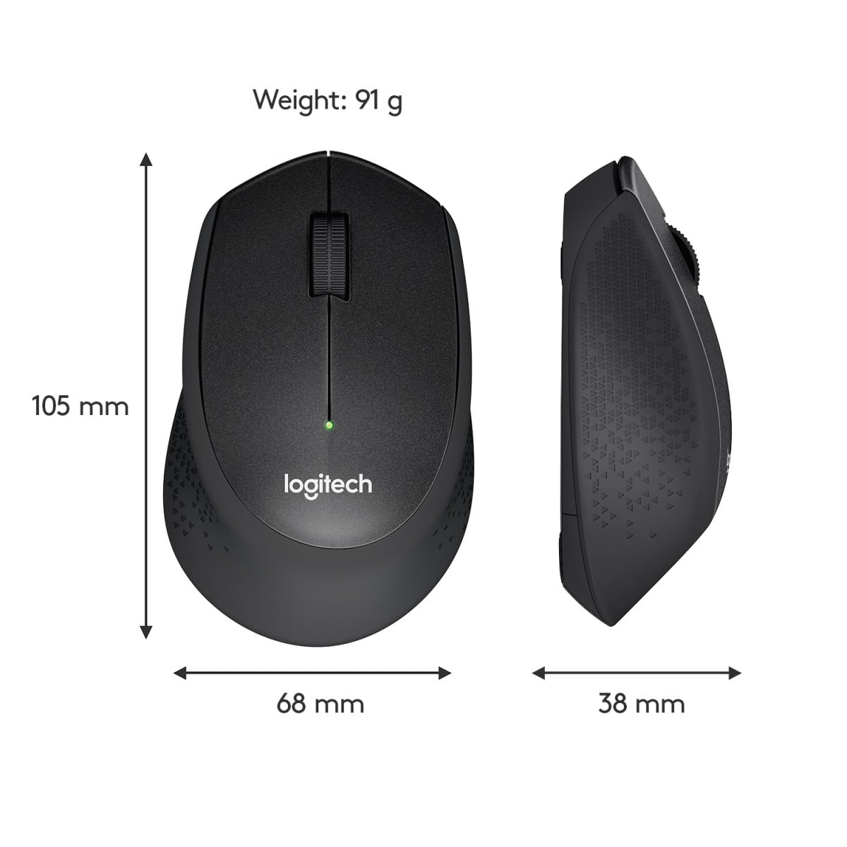 Logitech M330 SILENT PLUS. Form factor: Right-hand. Movement detection technology: Mechanical, Device interface: RF Wireless, Movement resolution: 1000 DPI, Buttons type: Pressed buttons, Buttons quantity: 3, Scroll type: Wheel. Power source: Batteries. Product color: Black