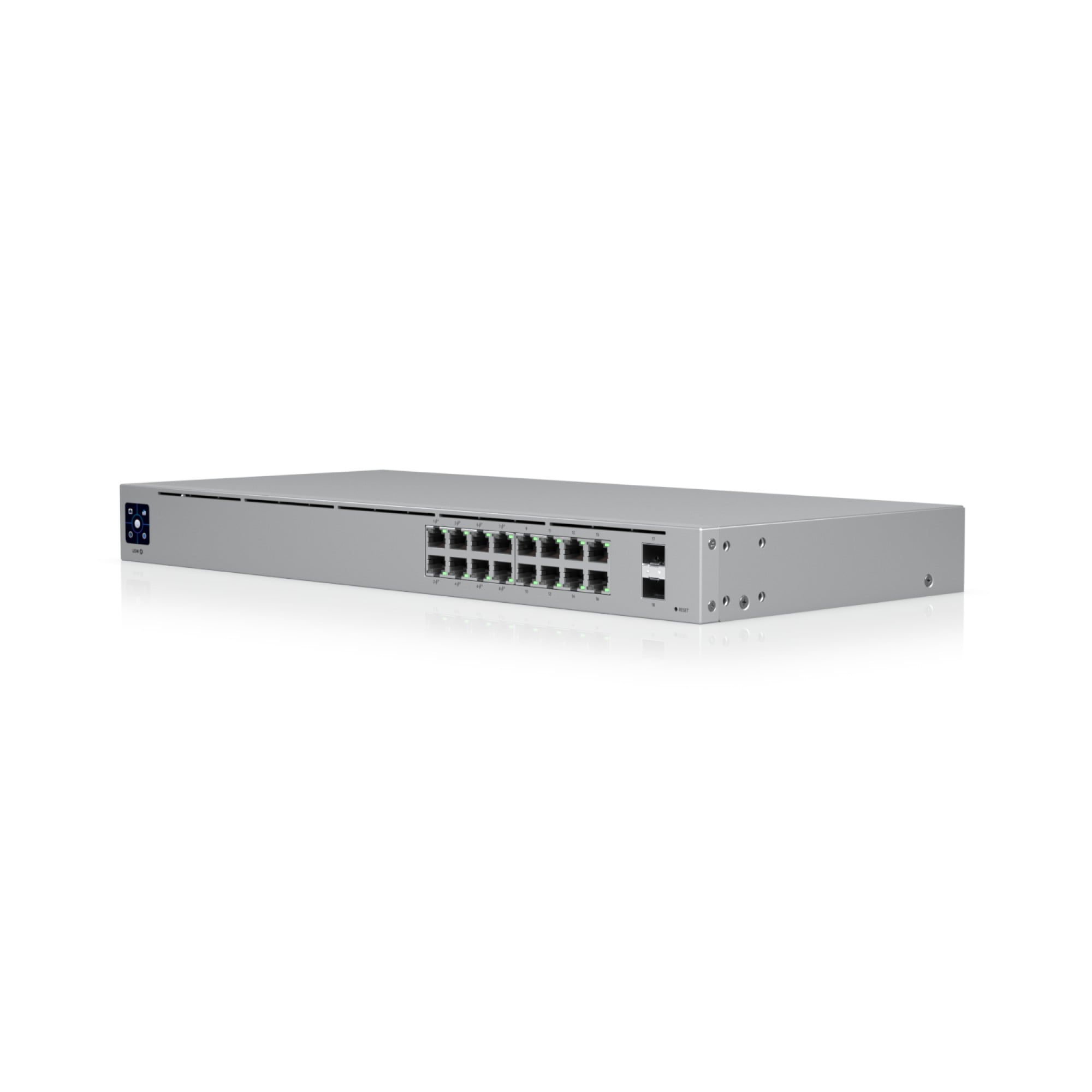 The USW-16-POE is a configurable Gigabit Layer 2 switch with sixteen Gigabit Ethernet ports including eight auto-sensing 802.3at PoE+ ports, and two SFP ports. It provides Gigabit PoE links to your RJ45 Ethernet devices and Gigabit fiber uplink options to your enterprise network. The USW-16-POE features a 1.3″ touch LCM to provide status information. With a depth of 7.9″, the compact fanless design can be easily installed in a SOHO rack cabinet.