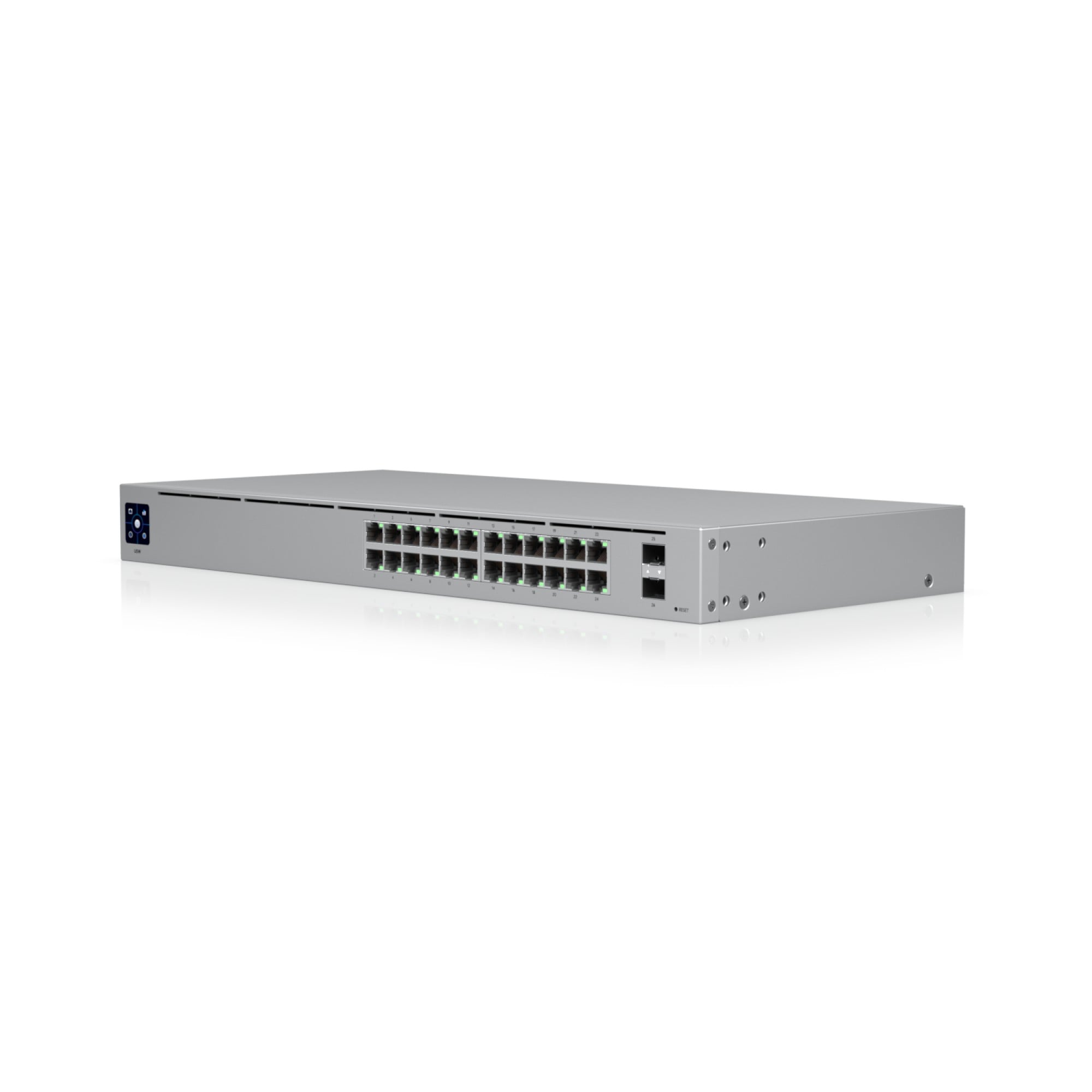 The Switch 24 (USW 24) is a fully managed, fanless switch with (24) GbE RJ45 ports and (2) 1G SFP ports. The versatile USW 24 provides Gigabit PoE links to Ethernet devices while also supplying Gigabit fiber uplink options fit for an enterprise network. The switch also offers an extensive suite of Layer 2 switching protocols, including port-specific operation modes (switching, mirroring, or aggregate), and features a 1.3″ LCM color touchscreen that concisely displays key system and connection insights. This switch can also be monitored or configured from anywhere with the powerful, intuitive UniFi Network web application and mobile app.
