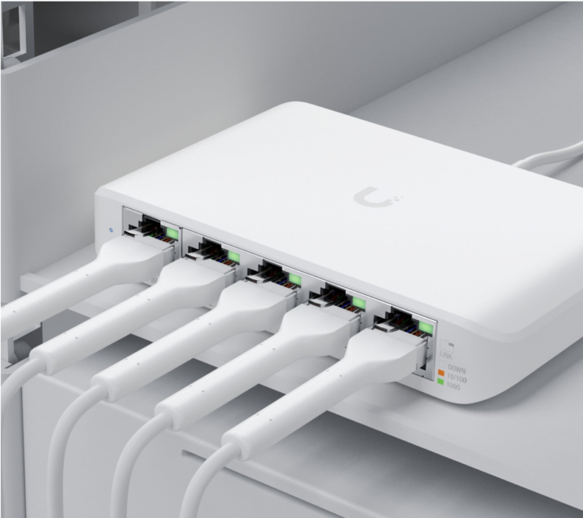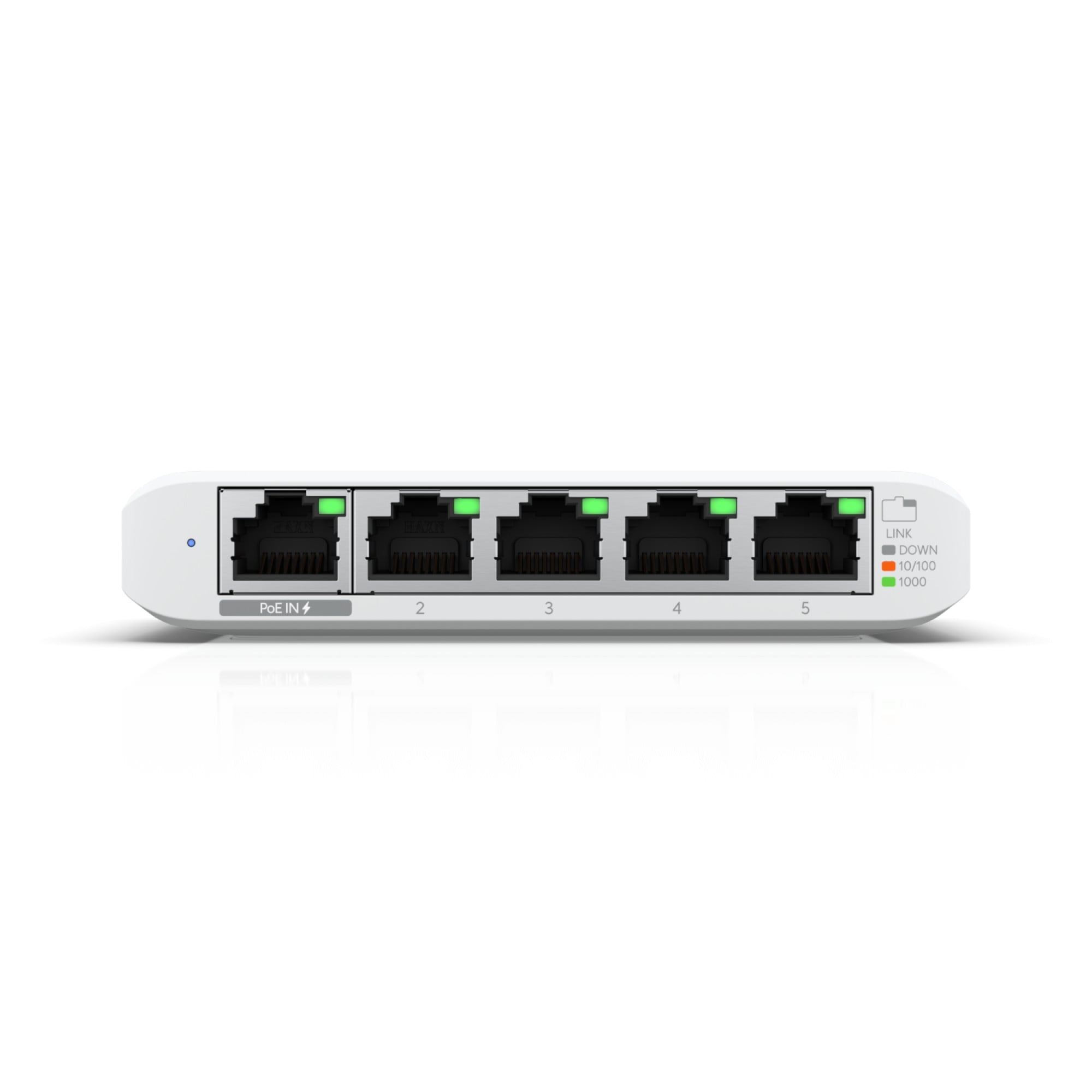 Build and expand your network with the UniFi® Switch, part of the Ubiquiti Networks® UniFi Enterprise System. The UniFi Switch, model USW-Flex-Mini, is a smart managed Gigabit switch. It offers 5 RJ45 Ethernet ports, providing 1 Gigabit links to your devices. Power up the USW-Flex-Mini with the included USB Type-C power adapter or with 802.3af PoE Ethernet in port 1.