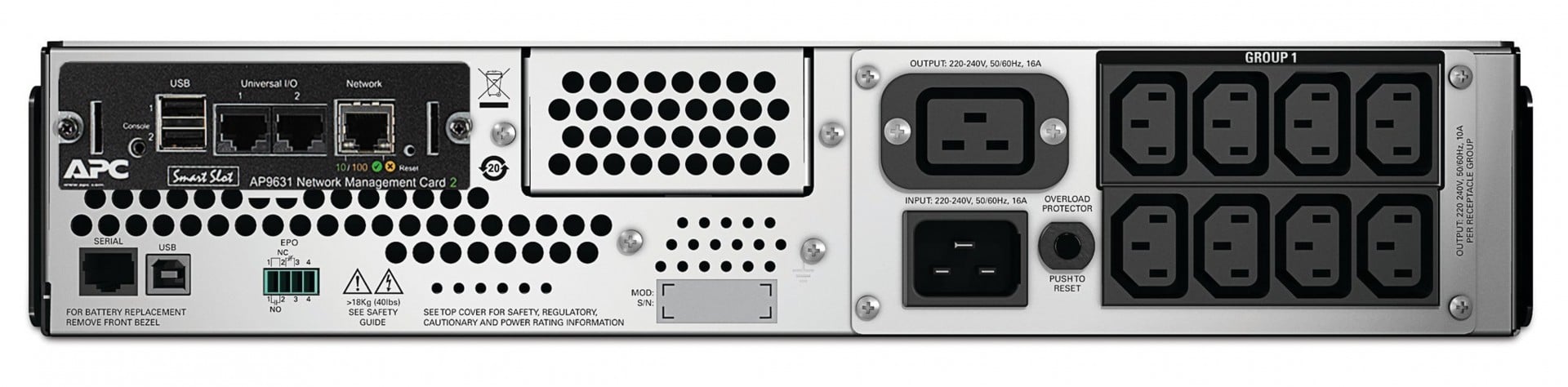 Patented green operating mode achieves efficiencies over 97%. Smart-ups was the first network UPS to be Energy Star certified. Intelligent battery management, pioneered by APC, maximizes battery performance and life through intelligent, precision temperature compensated charging. Dynamic battery replacement date indicator and automatic self tests insure battery reliability and warn in advance of needing replacement. Convenient, easy to connect, hot-swappable battery modules provide battery replacement without powering down. Designed and manufactured by APC for over 23 years, Smart-UPS is the world’s most trusted network UPS with over 25 million units sold.