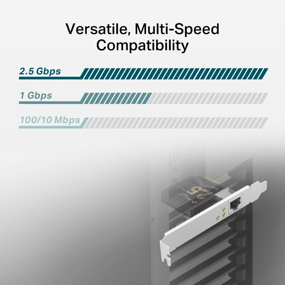 Enhance your computer’s networking capabilities with the TP-Link TX201 2.5 Gigabit PCIe Network Adapter. Designed for internal installation, this adapter connects through a PCI Express host interface, ensuring a stable and secure fit inside your desktop. Utilizing wired connectivity technology, it provides a reliable network connection without the inconsistencies often associated with wireless setups. The adapter features an Ethernet interface capable of supporting maximum data transfer rates up to 2500 Mbit/s, facilitating rapid file transfers and smooth streaming experiences.
