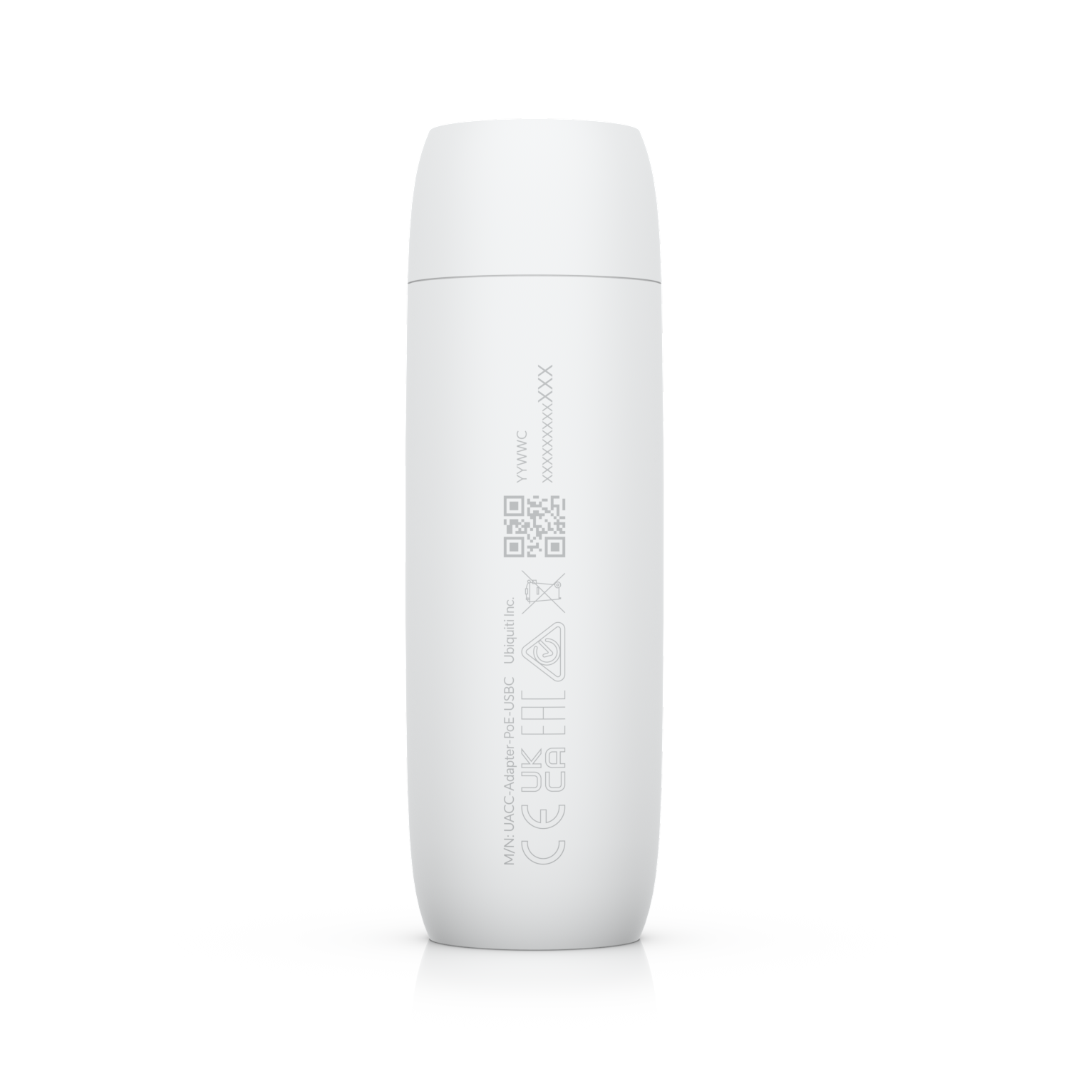 Ubiquiti UACC-ADAPTER-POE-USBC. Product color: White. AC adapter input voltage: 48 V, Input voltage: 5 V, Input current: 0.25 A. Certification: CE, FCC, IC. Width: 1.2″ (30.4 mm), Depth: 1.2″ (30.4 mm), Height: 3.74″ (95 mm)