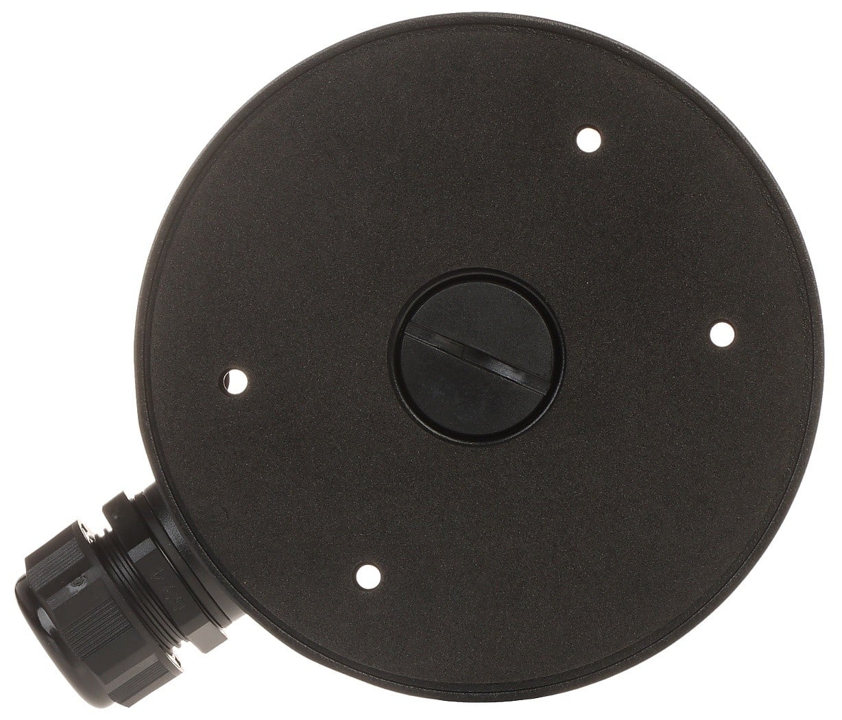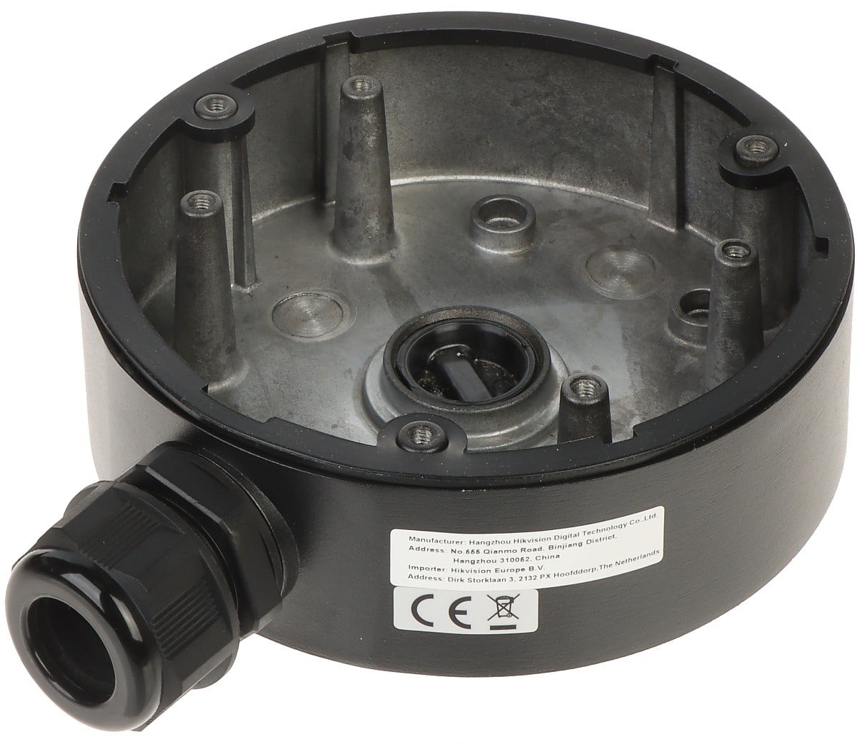 This junction box is designed to offer a secure and neat installation solution for compatible surveillance cameras. Crafted from aluminum alloy, it ensures durability and resistance to weather elements, making it suitable for both indoor and outdoor use. The unit comes in a black finish, which allows for a discreet and unobtrusive appearance when mounted.
