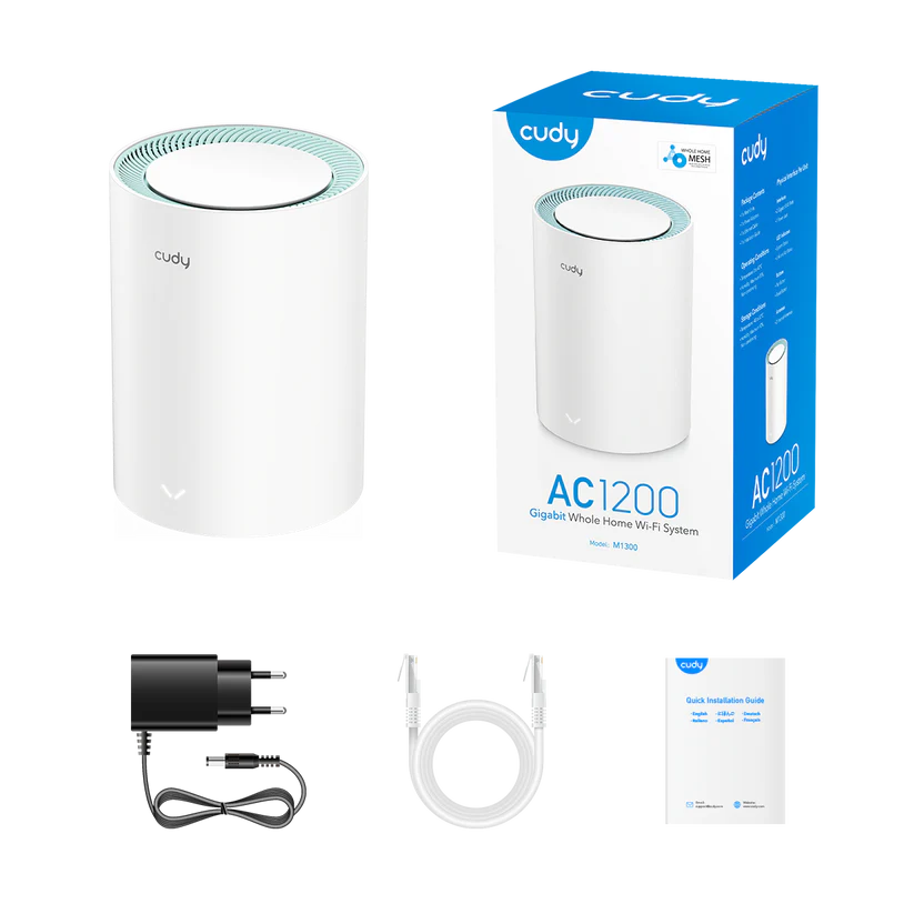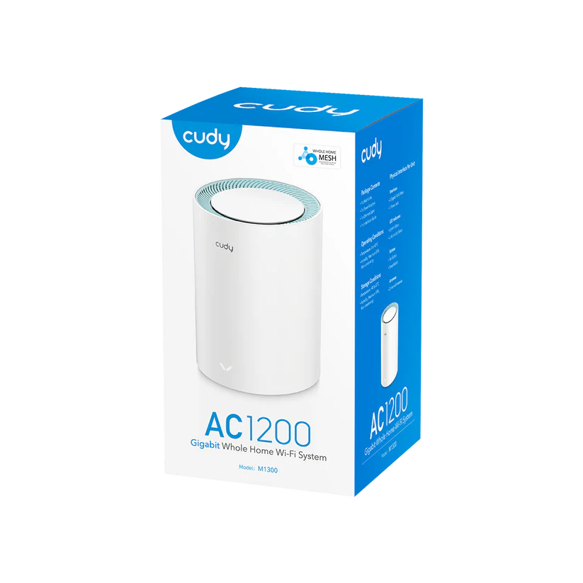 Cudy M1300 1-PACK. Product color: White, Antenna type: Internal, Product type: Mesh system. Wi-Fi band: Dual-band (2.4 GHz / 5 GHz), Top Wi-Fi standard: Wi-Fi 5 (802.11ac), Wi-Fi standards: 802.11a, 802.11b, 802.11g, Wi-Fi 4 (802.11n), Wi-Fi 5 (802.11ac). Internal memory: 16 MB, Flash memory: 128 MB. AC adapter output voltage: 12 V, AC adapter output current: 1 A. Number of products included: 1 pc(s), Number of units included: 1 pc(s)