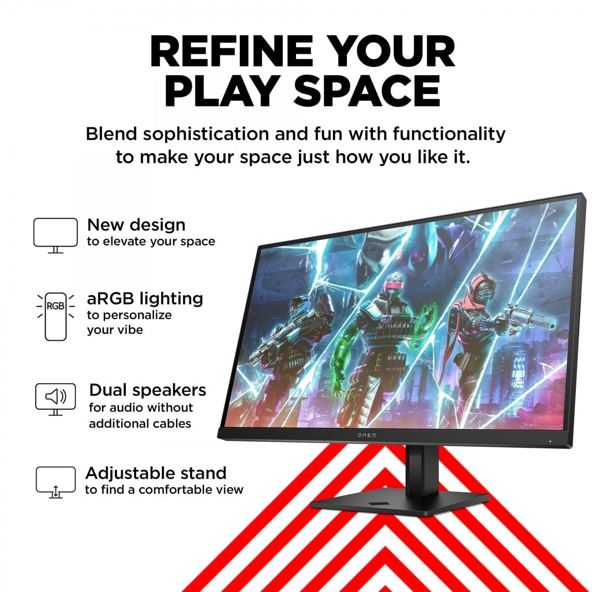 Designed with user comfort in mind, the HP OMEN monitor features HP Eye Ease technology, which reduces blue light emissions, allowing for extended gaming sessions without eye strain. The 3-sided borderless bezel enhances the aesthetic appeal and maximizes screen real estate, while the VESA mount compatibility offers flexible installation options. The monitor also includes integrated speakers and a variety of connectivity options, including 2 HDMI 2.0 ports and 1 DisplayPort™ 1.4, ensuring compatibility with a wide range of devices.