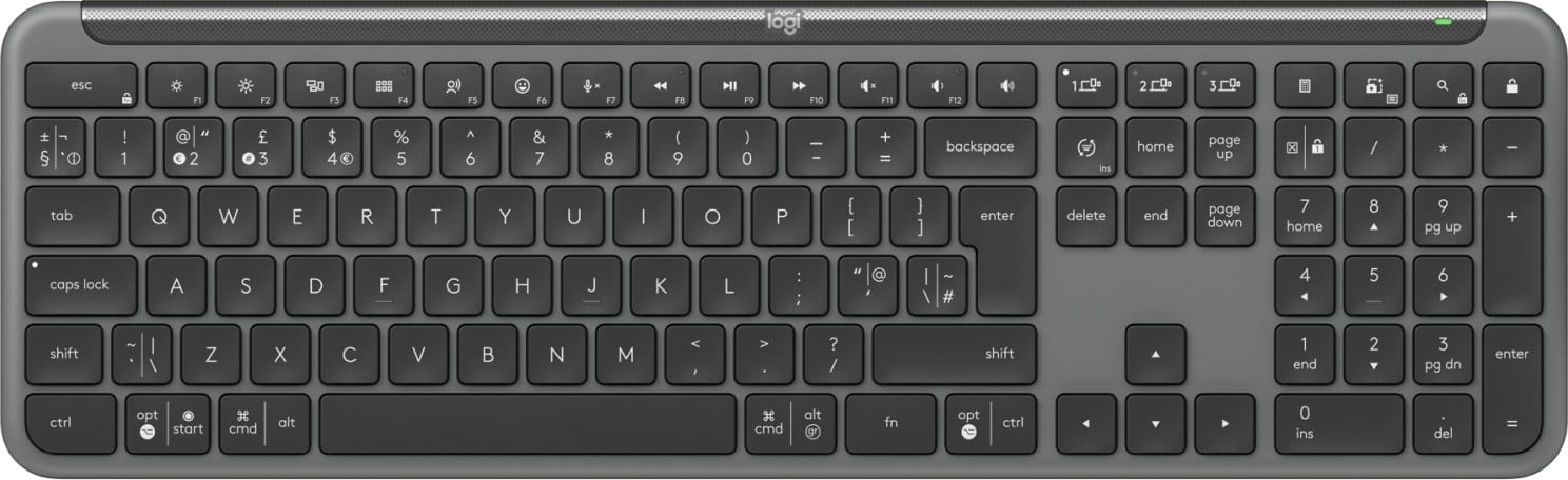 Logitech 920-012511. Keyboard form factor: Full-size (100%). Keyboard style: Straight. Connectivity technology: Wireless, Device interface: RF Wireless + Bluetooth, Keyboard key switch: Scissor key switch, Keyboard layout: QWERTY, Recommended usage: Office. Product color: Graphite. Mouse included