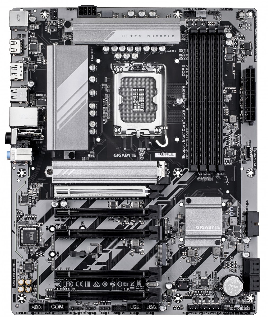 GIGABYTE B860 DS3H WIFI6E. Processor manufacturer: Intel, Processor socket: LGA 1851 (Socket V1), Compatible processor series: Intel Core Ultra (Series 2). Supported memory types: DDR5-SDRAM, Maximum internal memory: 256 GB, Memory slots type: DIMM. Supported storage drive interfaces: M.2, SATA III, Supported storage drive types: HDD & SSD, RAID levels: 0, 1, 5, 10. Maximum resolution: 4096 x 2160 pixels. Ethernet interface type: 2.5 Gigabit Ethernet, LAN controller: Realtek RTL8125, Top Wi-Fi standard: Wi-Fi 6E (802.11ax)