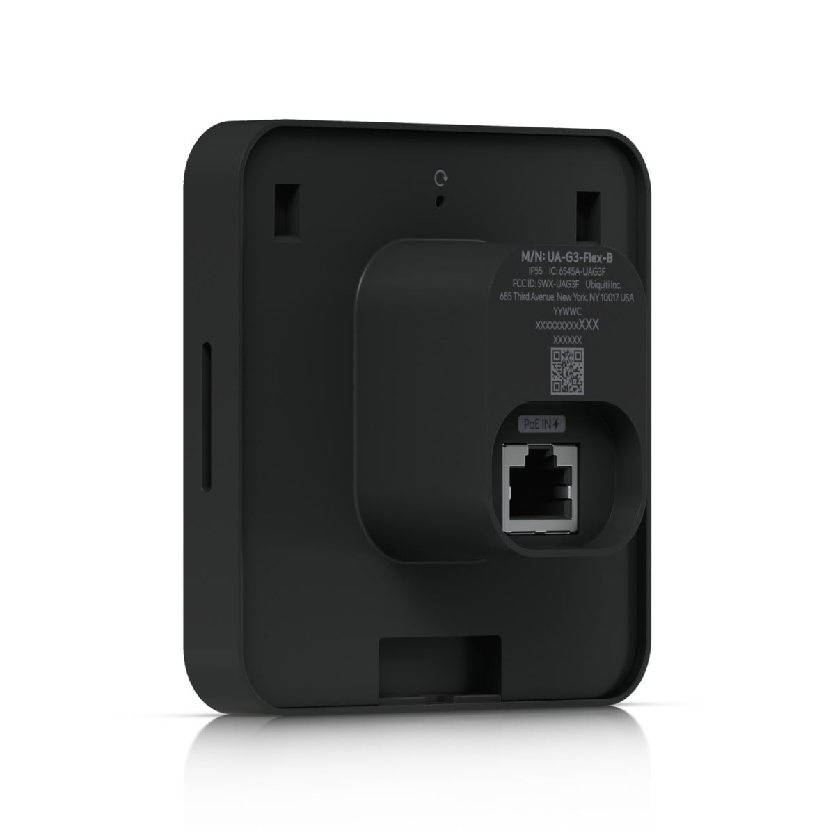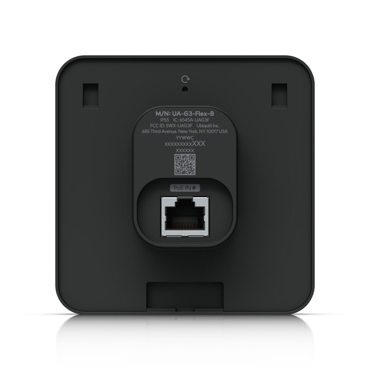 Ubiquiti Reader Flex. Speaker power: 1 W. Ethernet LAN data rates: 10,100 Mbit/s, Cabling technology: 10/100. Power consumption (max): 5 W, DC voltage range: 44 – 57 V. Width: 3.31″ (84 mm), Depth: 1.61″ (40.8 mm), Height: 3.31″ (84 mm)