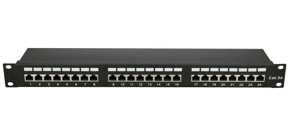 Extralink Patchpanel CAT5E STP V2 24 port. Connector(s): RJ-45, Cable types supported: Cat5e, Cable shielding: S/UTP (STP). Rack capacity: 1U, Product color: Black. Width: 19″ (482.6 mm)